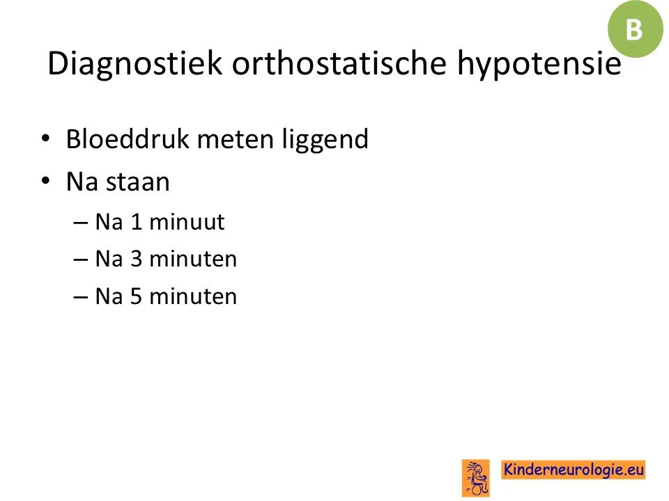 Bij orthostatische hypotensie faalt de sympaticus en daalt de bloeddruk bij langer staan. Dit gebeurt niet meteen, maar pas na 1-2 minuten, soms zelfs nog later.