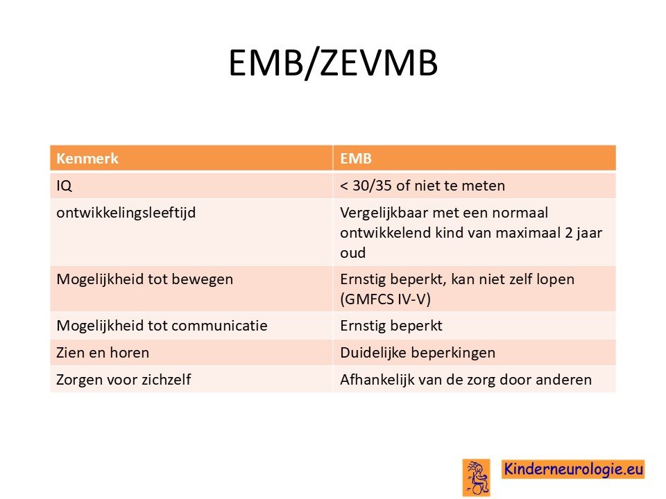 Een deel van de kinderen heeft een ernstige of zeer ernstige ontwikkelingsachterstand op meerdere gebieden. Dit wordt ook wel EMB: ernstig meervoudig beperking of ZEVMB zeer ernstige verstandelijke en meervoudige beperking genoemd.