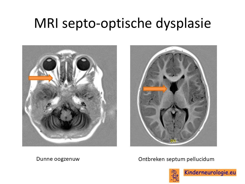 Wanneer een kind een ontwikkelingsachterstand heeft in combinatie met problemen met zien zal vaak snel een MRI-scan van de hersenen gemaakt worden. Op deze MRI scan is het ontbreken van het tussenschot tussen de beide hersenkamers (septum) te zien. Ook is op een MRI-scan goed te zien dat de oogzenuwen dun en onderontwikkeld zijn.
